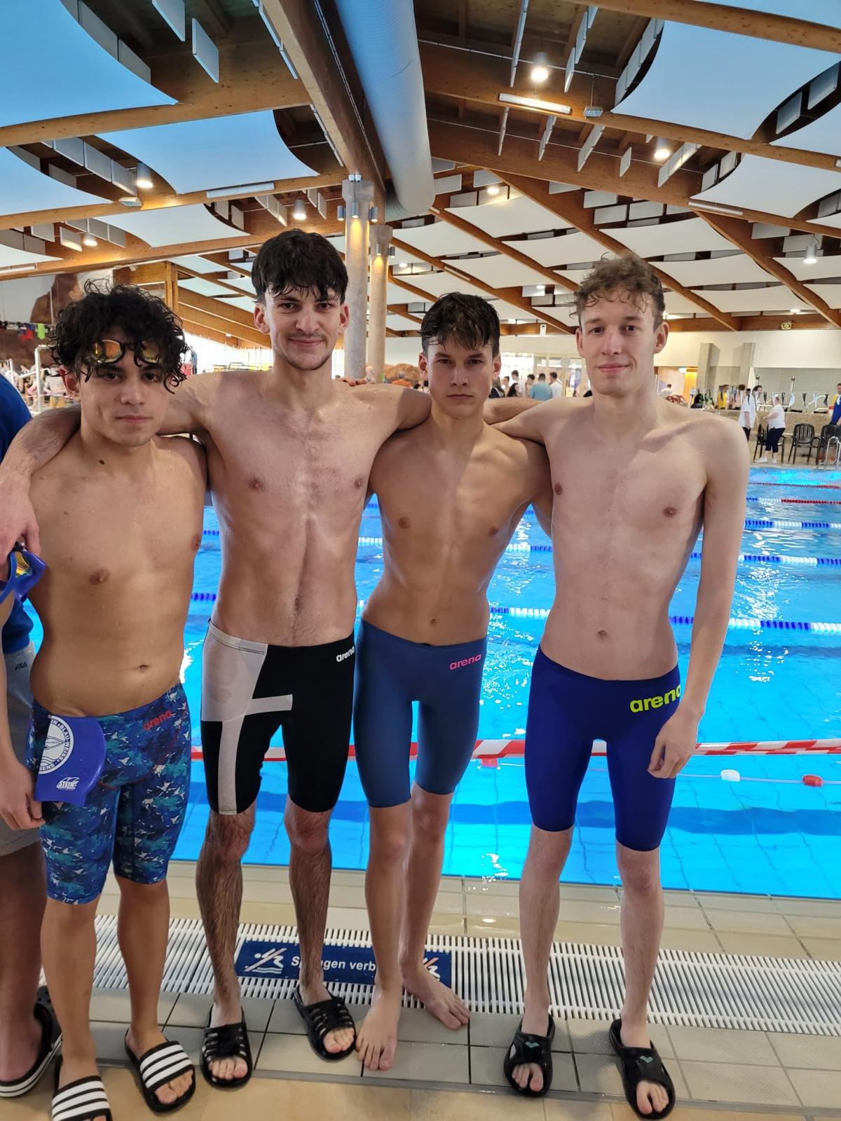 Ein echtes Highlight bildete die 8 x 50 Meter Lagenstaffel am Sonntagabend. In der Besetzung Emilie Seither, Sören Kölsch, Leni Herrmann, Marc Bißbort, Elena Baranava, Jonas Bäsel, Stella Dubois und Hugo Seither erschwamm sich das Team einen starken zweiten Platz.