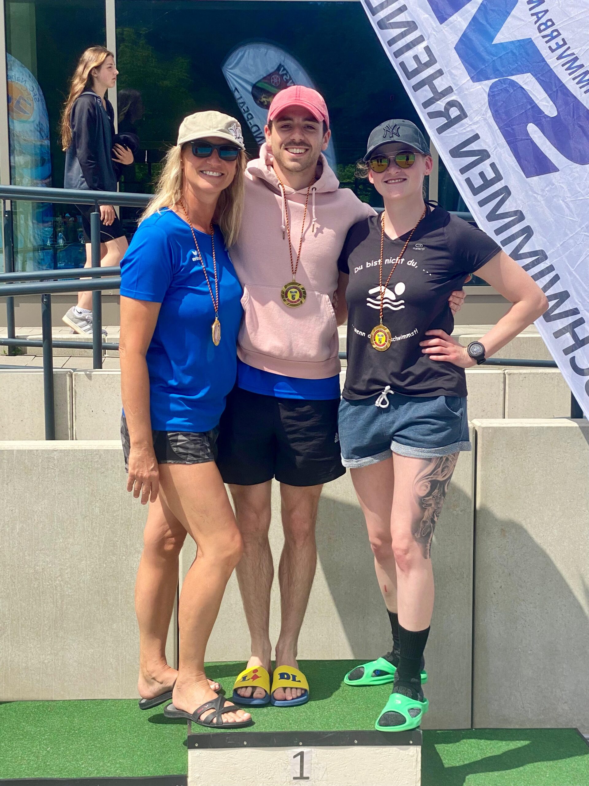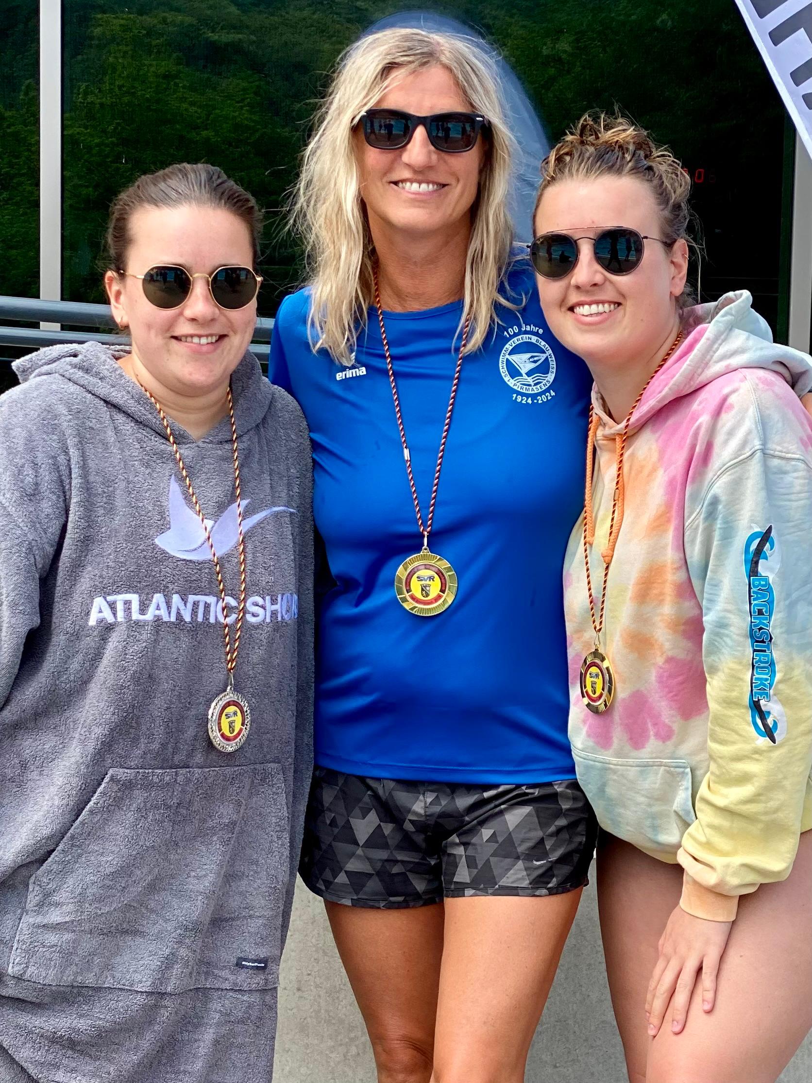 Die 25-jährige Claire Peifer, konnte all Ihre 5 Starts mit dem Meistertitel beenden und sich über Gold freuen. Das konnte nur noch die 52-jährige und damit die älteste Teilnehmerin des 1. Schwimmvereins, Mirjam Semmet, mit 6 Starts und 6 Meistertiteln toppen. Die 25-jährige Jessica Weigel erschwamm 3 Meistertitel und 2 Silbermedaillen. Die Drei sind sonst eher am Beckenrand als Trainerinnen des 1. Schwimmvereins anzutreffen und freuten sich umso mehr, an diesem Wochenende mal wieder selbst aktiv sein zu können und zu beweisen, dass auch sie das Schwimmen noch nicht verlernt haben, so Mirjam Semmet mit einem Lächeln im Gesicht.